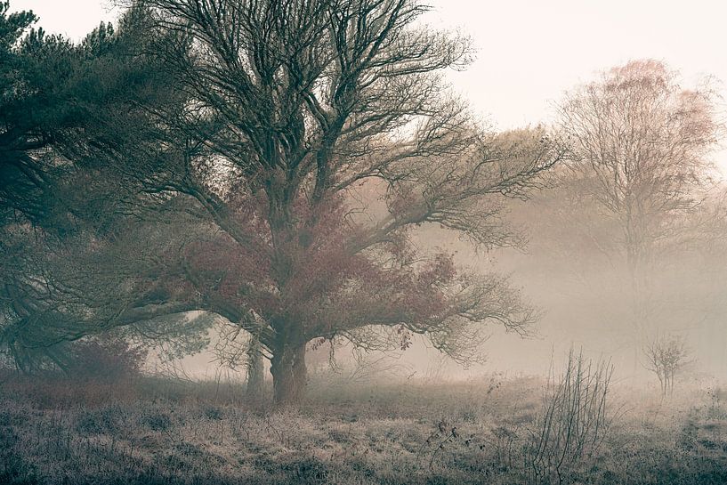 Landschap op de Wolfhezerheide in Doorwerth, op de Veluwe in Gelderland. Het is een koude ochtend in maart en het is mistig. De zon komt op en zorgt voor een mooie sfeer. Hier is gebruik gemaakt van meervoudige belichting, waar meerdere foto's werden samengevoegd in de camera.