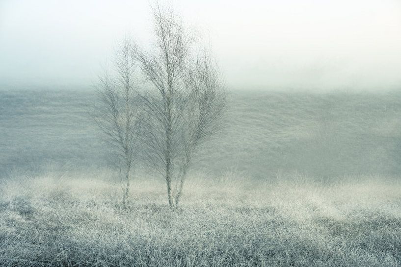 Landschap op de Wolfhezerheide in Doorwerth, op de Veluwe in Gelderland. Het is een koude ochtend in maart en het is mistig. De zon komt op en zorgt voor een mooie sfeer. Hier is gebruik gemaakt van meervoudige belichting, waar meerdere foto's werden samengevoegd in de camera.