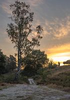 Portret op de Wolfhezerheide in Doorwerth, op de Veluwe in Gelderland, tijdens zonsopkomst. Je ziet een glooiend wandelpad, een hoge berkenboom en de lucht die oranje kleurt door de opkomende zon en de wolken.