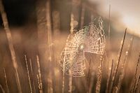 Close up van een spinnenweb gemaakt op de Wolfhezerheide in Doorwerth, op de Veluwe in Gelderland. het gouden licht van de opkomende zon zorgt ervoor dat de begroeiing van de heide eruit ziet als gouden sieraden.