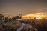 Landschap op de Wolfhezerheide in Doorwerth, op de Veluwe in Gelderland, met zicht op een wandelpad dat tussen de begroeiing van de heide loopt, en de lucht die donker oranje kleurt door de opkomende zon onder het wolkendek.