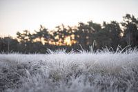 Landschap op de Wolfhezerheide in Doorwerth, op de Veluwe in Gelderland. Het is een koude winterochtend met rijp en de zon komt langzaam op achter de bomen.