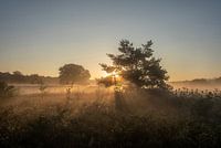 Landschap op de Wolfhezerheide in Doorwerth, Gelderland. De zon komt op over de nevelige heide, wat voor een magische sfeer zorgt.