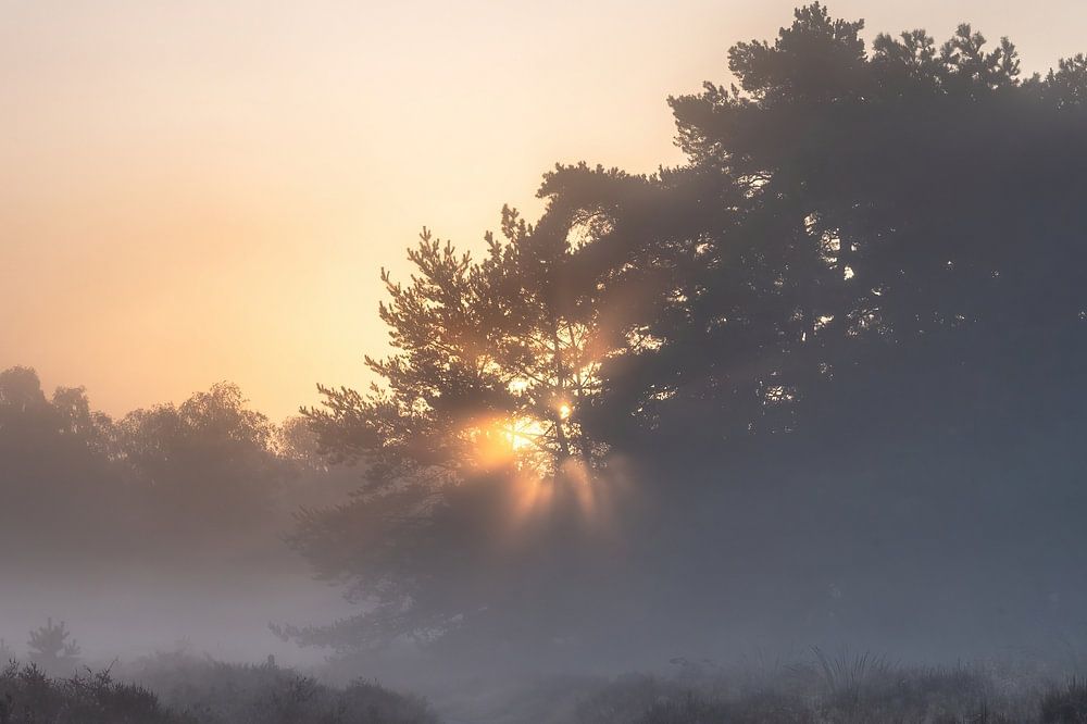 Landschap op de Wolfhezerheide in Doorwerth, op de Veluwe in Gelderland. De nevel hangt over de heide en de zon komt langzaam op, wat voor een magische sfeer zorgt.