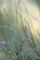 Close up van de bloeiende heide, met een zachte en zonnige pastelkleurige achtergrond.