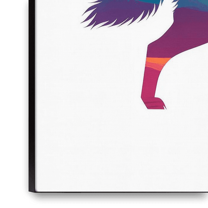 Een majestueuze wolf beweegt zich met krachtige elegantie door een dromerig landschap waarin zonsondergang en bergen harmonieus in elkaar overgaan. De levendige kleuren stralen energie en een gevoel van avontuur uit. Dit kunstwerk is perfect voor een woonkamer, waar het een uitnodigende, inspirerende sfeer creëert.