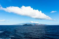 Wolk boven Madeira. Het eiland is omringd door het donkerblauwe water van de Atlantische Oceaan en, op de langgerekte wolk na, prachtig blauwe lucht.