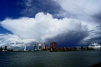 Foto van een grote wolk boven de Nieuwe Maas in Rotterdam. In de skyline van links naar rechts: de Erasmusbrug, de Kop van Zuid, Katendrecht en het schip SS Rotterdam.