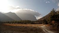 Een wolk met ondergaande zon achter het gebergte van de Annapurna, Bij Pisang in de Himalaya van Nepal.