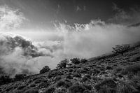 Zwart wit foto van wolken die de bergen beklimmen in Dukat, Albanië. Witte wolk probeert een dorre, droge berg omhoog te klimmen. Lage struiken en bomen steken sterk af tegen de witte, ruige wolken.
