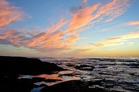 Het einde van de dag na een spectaculaire zonsondergang is zo vredig. Hier genieten we van de wolken van de zonsondergang op Ocean Beach in de stad San Diego, Californië, VS. De reflectie van de oranje gloed in het water tussen de rotsen heeft echt een kalmerend effect.