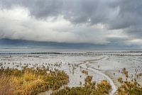 Wolken boven Waddenzee bij Holwerd tijdens laag water