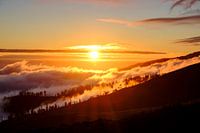 Wolken boven de bergen bij Rabaçal op Madeira eiland bij zonsondergang aan het einde van een mooie zomerdag.