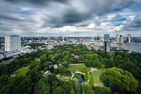 Wolken bewegen in hoog tempo over de skyline van Rotterdam. De foto is genomen vanaf de Euromast. Onderaan is het Park bij de Euromast te zien, met links het Erasmus MC, in de verte de Erasmusbrug en de hoogbouw op de Wilhelminapier.