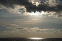 De zee met daarin de weerspiegeling van het water, daarboven donkere wolken die de zon verduisteren.