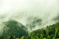 Wolken en mist bewegen over het dennenbos in de Zgornje Jezersko vallei in Slovenië tijdens een lentedag in de Kamnik-Savinja Alpen.