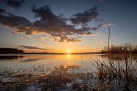Foto van de zonsondergang op natuurgebied "Het Scharreveld" in Drenthe. Te zien op de foto is de zon, die langzaam achter de horizon weg zakt. Er zijn wolken die mooi opkleuren door de zon en weerspiegeld worden in het water van de van. Het Scharreveld is een natuurgebied van het Drentse landschap nabij Westerbork. Prachtig…