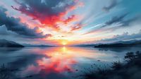 De foto toont een adembenemende zonsondergang boven een uitgestrekte zee van wolken, die oplichten in zachte pastelkleuren. De zon, een gloeiende bol van warm goud, komt langzaam tevoorschijn vanachter de wolken en kleurt de lucht in levendige tinten oranje, roze en violet. Deze kleuren vermengen zich harmonieus en creëren een…