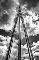 Een blik op de hemel - scherpe lijnen van glas en staal breken door het wolkendek. Deze moderne architecturale kathedraal rijst op in het midden van de Hamburgse lucht. De wolken worden weerspiegeld in de gevel, glas en lucht smelten bijna samen. Alleen helemaal onderaan blijft een vage verwijzing naar de aarde over - de weerspiegeling van een boom, bewust in het beeld geïntegreerd als een stil contrapunt.