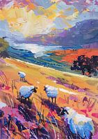 Het doek is gedomineerd door een hemel vol bewegende wolken, geschilderd in een diversiteit aan kleuren van zachtgeel en wit tot roze en blauw, wat de transitie van dag naar avond lijkt voor te stellen. Deze kleurrijke lucht reflecteert zachtjes op het water beneden, wat een gevoel van rust en diepte geeft aan het landschap. De heuvels op de achtergrond worden weergegeven met warme aardetinten, die contrasteren met de koele kleuren van de lucht en het water, wat een balans en harmonie creëert in het schilderij. Op de voorgrond staan schapen rustig te grazen, elk zorgvuldig geplaatst tussen de heldere kleuren van de wilde bloemen en de grassen van de weide. De schapen, geschilderd met een mengeling van witte en blauwe tinten, voegen een vredig element toe aan het dynamische landschap.