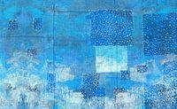 Scandinavisch minimalisme in blauwe natuurlijke kleuren monochroom. Een abstract schilderij op handgeweven zijden stof in geometrische vormen die de cultuur van Noord-Europa interpreteert.