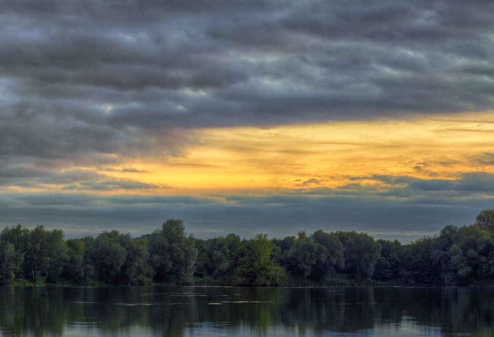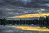 Das Bild zeigt einen bewölkten Himmel während des Sonnenuntergangs über einem See.