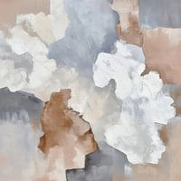 Gelaagde abstractie in een harmonieus palet van wit, beige, lichtbruin, grijs en koelblauw. De vormen lijken als wolken of aardlagen over elkaar te zweven, met vage grenzen en doezelige overgangen. De verf is dik en expressief aangebracht, met zichtbare texturen en bewegingen die het schilderij een tactiele, bijna sculpturale kwaliteit…