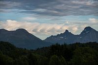 De foto bestaat uit verschillende lagen van bergen en wolken, maar ook uit verschillende kleuren. Landschapsfoto van Noord Noorwegen.