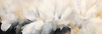 Een glinsterend samenspel van zachte witte en grijze tinten ontvouwt zich alsof de lucht beweegt in een kalme bries. De vage contouren creëren tegelijkertijd een gevoel van lichtheid en droefheid, terwijl delicate gouden accenten als zonnestralen door de wolken heen flitsen. Een harmonieus samenspel dat uitnodigt om te dromen.