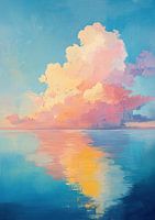 Olieverfschilderij van een roze en blauwe wolk met een weerspiegeling op het water, in een heldere hemelsblauwe en gele stijl, met een op het platteland geïnspireerde esthetiek, romantische landschappen, pastelkleuren, kleurrijke wolken, gedempte verlichting en een minimalistische benadering.