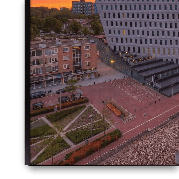 Koop dit moderne kunstwerk Wolkenkrabber Den Haag tijdens zonsondergang van Rob Kints op canvas, aluminium dibond, (ingelijste) fotoprint, behang en ArtFrame, op maat geprint in Fine-Art kwaliteit.