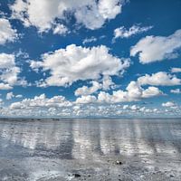 Buitendijkse wolkenlucht boven het Waddengebied en weerspiegeld in het natte slik ter hoogte van Paesens-Moddergat in de provincie Friesland