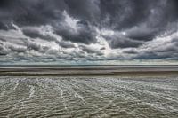 Wolkenlucht op het Waddengebied tussen Holwerd en Ameland bij eb en dreigende regen.
