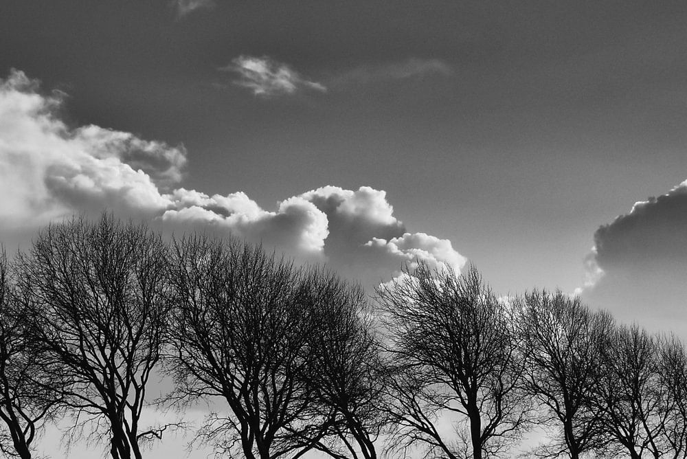 Prachtige wolkenlucht met bomenrij aan het water.