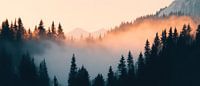 Zachte mist omhult majestueuze dennenbomen en heuvelachtige silhouetten, terwijl de gouden ochtendzon het landschap zachtjes streelt. Dit harmonieuze landschap brengt rust en een vleugje natuur in elke woonkamer, perfect om het leven van alledag achter je te laten en je onder te dompelen in een vredige, ontspannen sfeer.