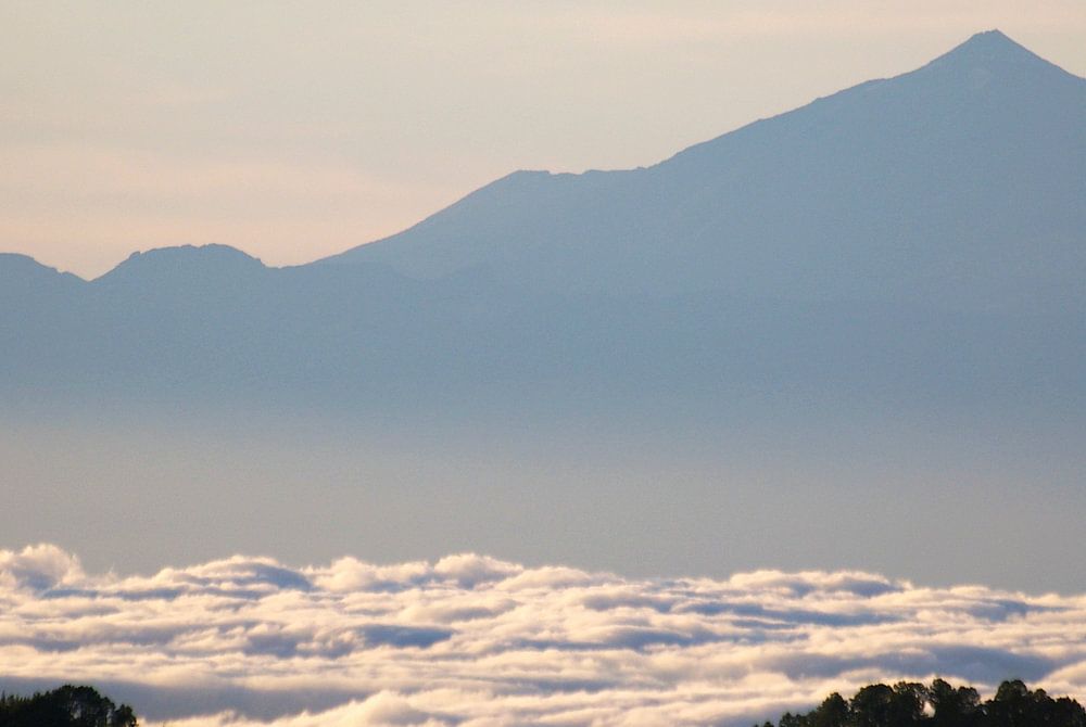 Wolken drijven een vallei binnen op Gran Canaria wanneer de avond begint te vallen. Strijklicht van de zon beschijnt de bovenkant van het lager gelegen wolkendek