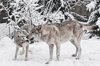 Wolven mannetjes en vrouwtjes spelen tijdens de paring in een besneeuwd winterbos bij sneeuwval.