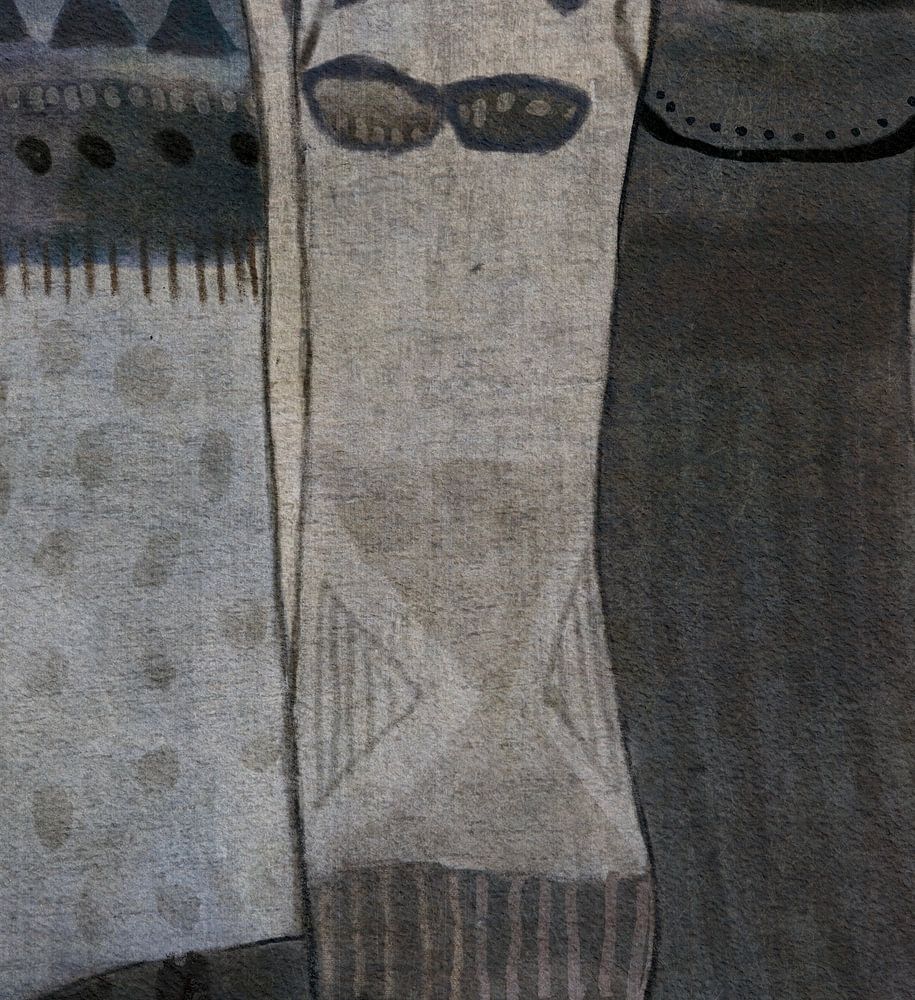 Drie figuren, verbonden door lijn, kleur en vorm, vertellen elk hun eigen verhaal.