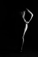 De lijnen van een vrouwelijk lichaam, subtiel belicht. De mooie vrouwelijke rondingen komen zo goed in beeld doordat alleen de "belijning" is belicht.