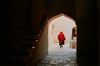 Deze vrouw viel vooral op door haar rode hoofddoek en volledig omringd door aardse kleuren.