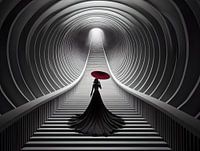 Vrouw in het zwart met rode paraplu beklimt de trappen in een modern gebouw