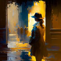 Impressionistisch schilderij van een prachtige dame, startend in de verte, observerend en bewust van de prachtige lichtinval.