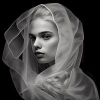 Zwartwit afbeelding van een mooie vrouw omhuld door zijde. Prachtig lichtinval, hetgeen een schitterend contrast geeft. Passend bij diverse trends.