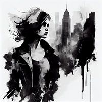Abstracte afbeelding van een vrouw en de stad. Zwart wit afbeelding vol emotie en verbeelding. Passend bij diverse trends en stijlen, waaronder Urban. Aquarel, nat watertechniek.