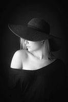 Mooie blonde vrouw poseert met een hoed. Een beetje verlegen voor de camera maar daardoor een mooie pose