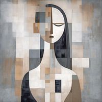 Een intrigerende compositie van een vrouwengezicht in een harmonieus, kubistisch blokpatroon. De complementaire kleuren grijs, wit en beige geven het werk een serene uitstraling, die wordt versterkt door de invloeden van de Romaanse kunst. Een fascinerende samensmelting van verschillende stijlen en elementen, vormen een prachtig, sereen en visueel statement.