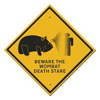 Cartoon - Warning sign - beware the wombat death stare. Much Australian fauna have characteristics which when used can have fatal consequences for humans. In the case of the wombat the animal can give a pretty evil look.