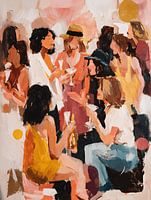 Een vrolijke scène van mensen in zomerse kleding die samen genieten. Bruisend, sociaal en vol zonlicht — perfect voor een levendige muur.
