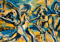 Abstracte weergave van vrouwen in beweging. Zijn het dansers, renners, zijn ze op de vlucht of feestvierend? De abstractie van het werk maakt het mogelijk je eigen verhaal te maken.