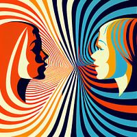Op-art afbeelding van twee vrouwen die met elkaar in gesprek zijn. Prachtige kleurstelling. Retro in oranje, blauw en geel. Lijnen. Passend bij diverse stijlen en trends. Modern Abstract.